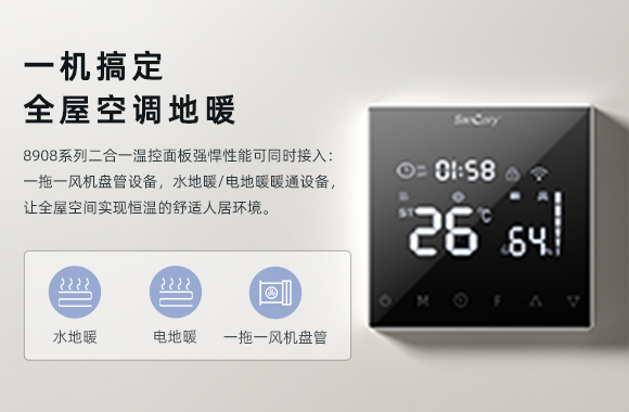 8908聯(lián)動款空調(diào)地暖二合一面板,適用于兩聯(lián)供主機。采用進口高精度溫濕度傳感器(溫度精度:±0.2,相對濕度精度:± 3%)??梢酝瑫r或獨立控制風(fēng)機、地暖,從而讓環(huán)境的溫度更舒適,滿足不同的需求。